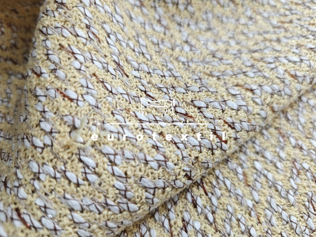 Középvastag buklé anyag, elegáns Halvány sárga, törtfehér, bézs színkombinációban. Jól alakítható és kiváló tartású.Kosztümök, Chanel blézerek,ruhák, szoknyák készítéséhez ajánljuk.