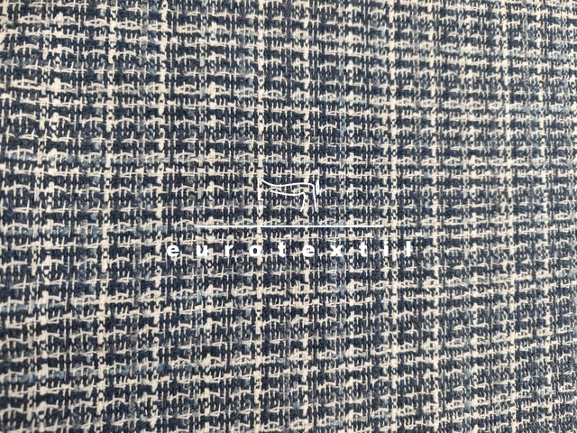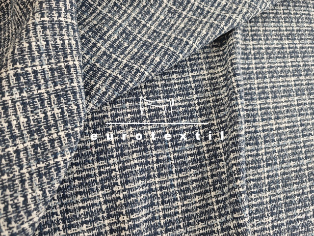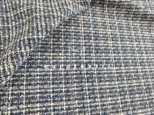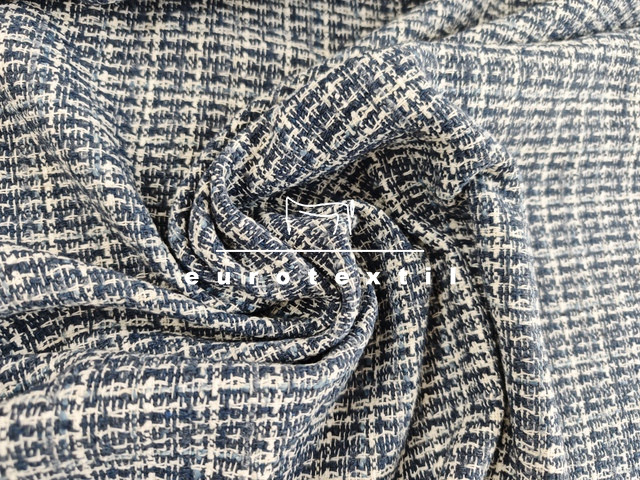 Középvastag buklé anyag, elegáns farmerkék, fehér színkombinációban. Jól alakítható és kiváló tartású.Kosztümök, Chanel blézerek,ruhák, szoknyák készítéséhez ajánljuk.