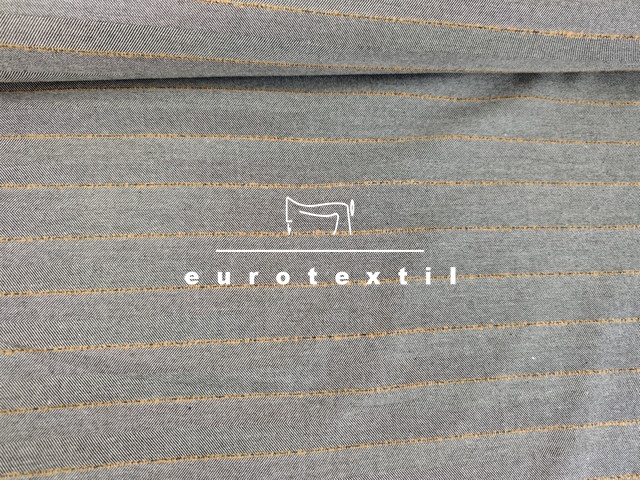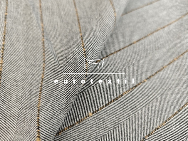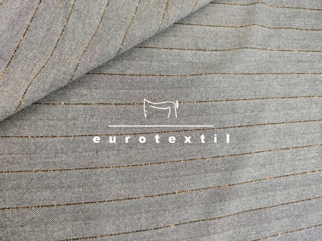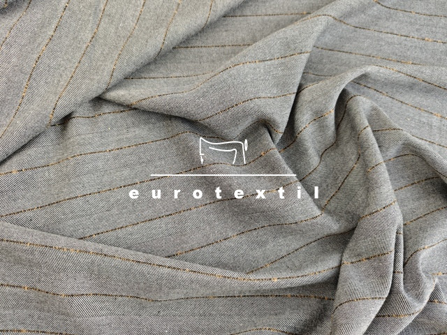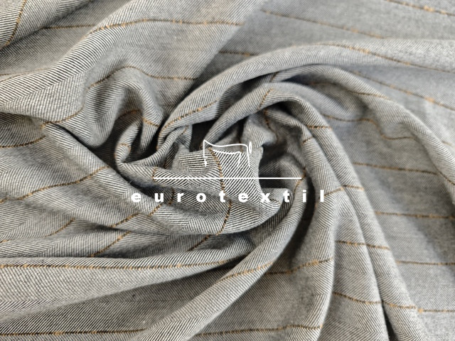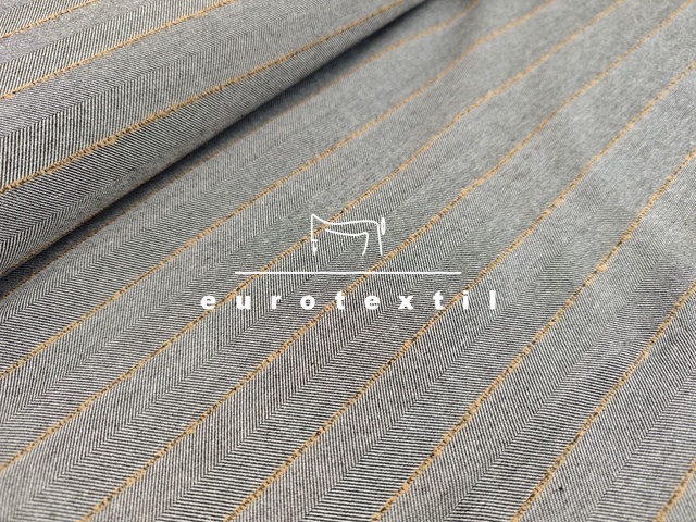 Kevert szálas, halszálka mintázatú, Kereszt irányban csíkos, közép vastag szövet. Jó esésű, középszürke alapon, barna csíkos színben. Hétköznapi és elegáns kosztümök, ruhák, öltönyök, nadrágok készítéséhez kiváló alapanyag.