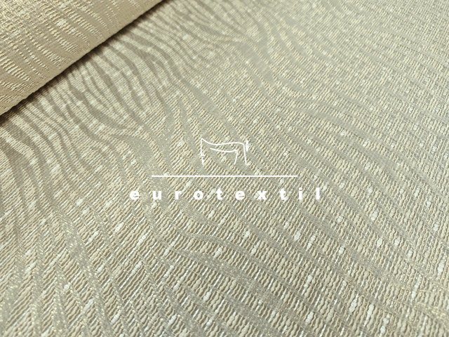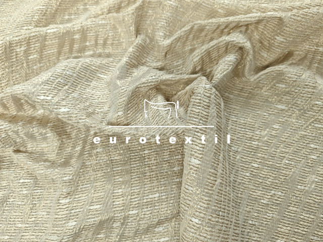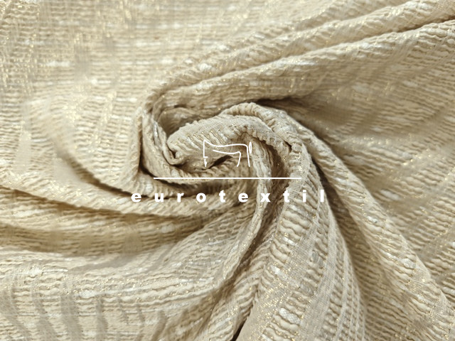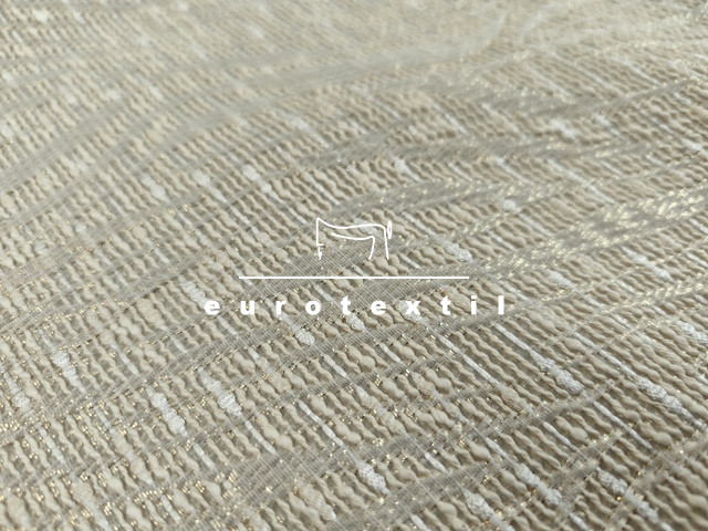 Fémszállal átszőtt különleges modern hullám mintás buklé anyag. A fémszál igazán finom alkalmi jelleget kölcsönöz a kelmének. Elegáns krém és arany szín kombinációja bármilyen alkalomra használhatóvá teszi.
