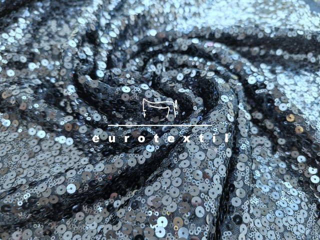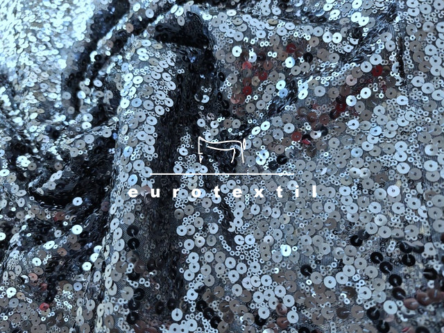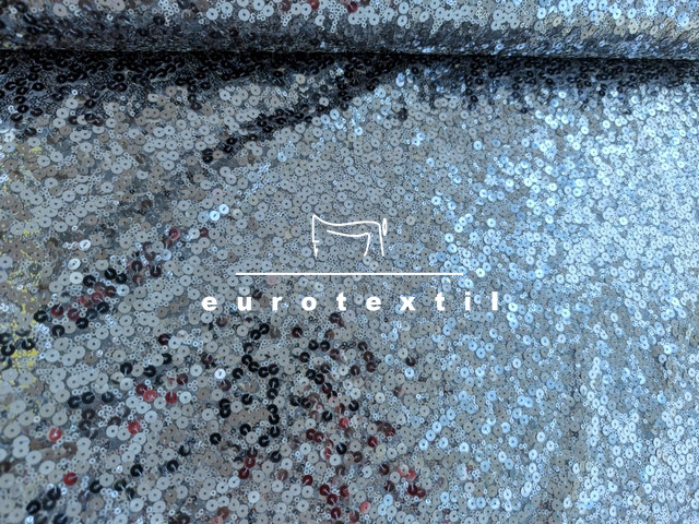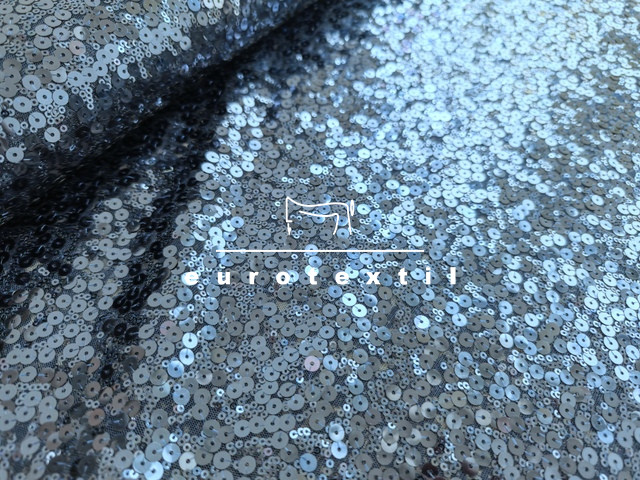 Elasztikus, közepes és kis méretű flitteres necc anyag, sötétkék színben.