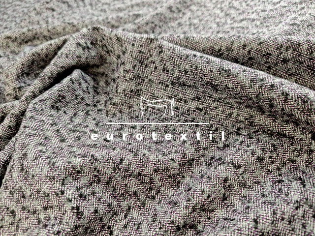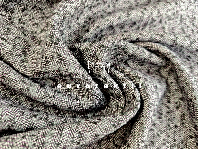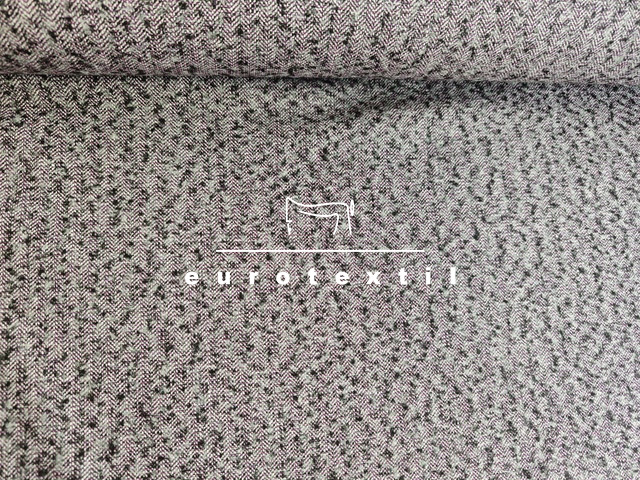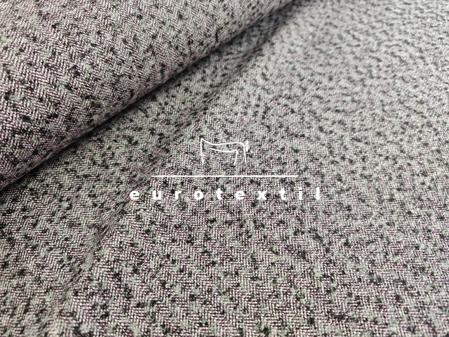 Középvastag halszálka mintás, kevert szálas tweed szövet. Szürke alapszín, lila-fekete noppokkal. Átmeneti kabátok, kosztümök, mellények,ruhák készítéséhez ajánljuk.