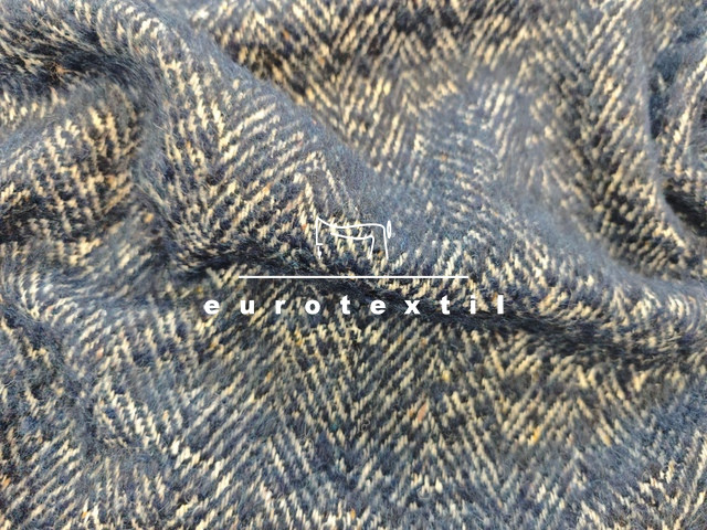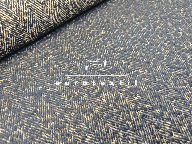 Sötétkék, törtfehér, nagy halszálkás, bolyhozott gyapjú kabátszövet. Kabátok, készítéséhez ajánljuk.