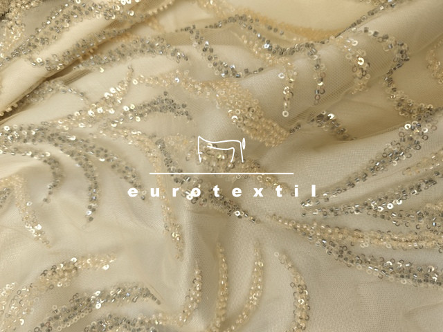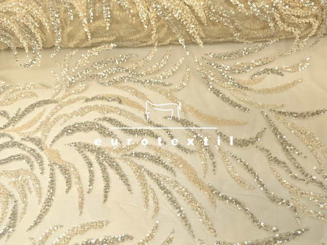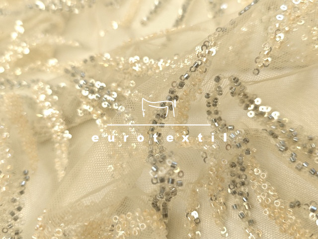 Flitterrel és gyönggyel díszített tüll anyag.