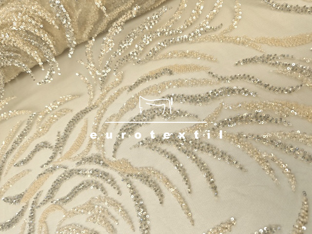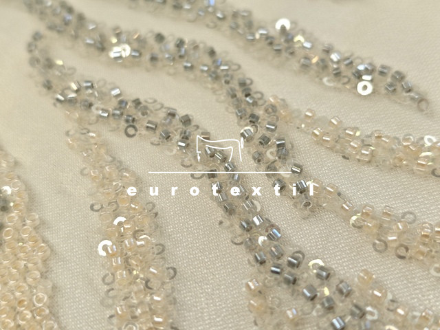 Testszínű alapon ezüst flitterrel és bézs üveggyöngyökkel hímezve.