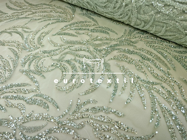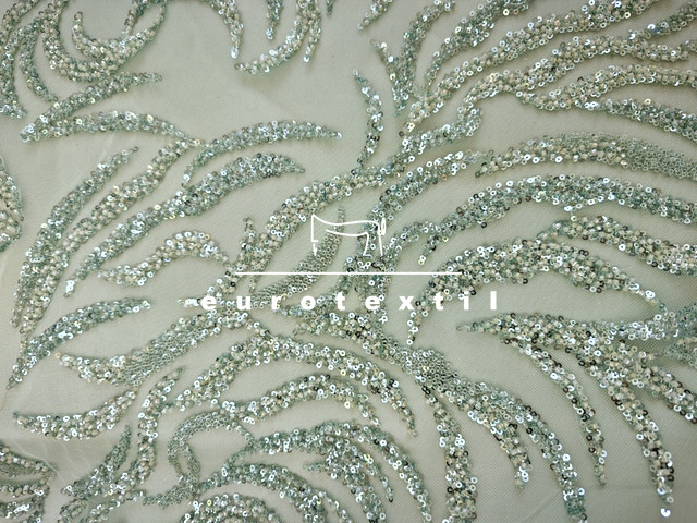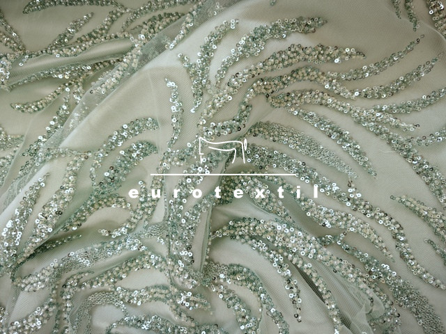 Hosszanti hullám mintás különleges alkalmi textil.Menta flitterrel és menta üveggyöngyökkel hímezve.
