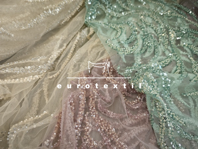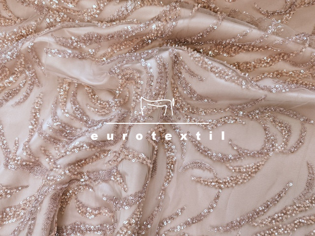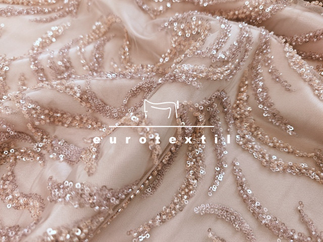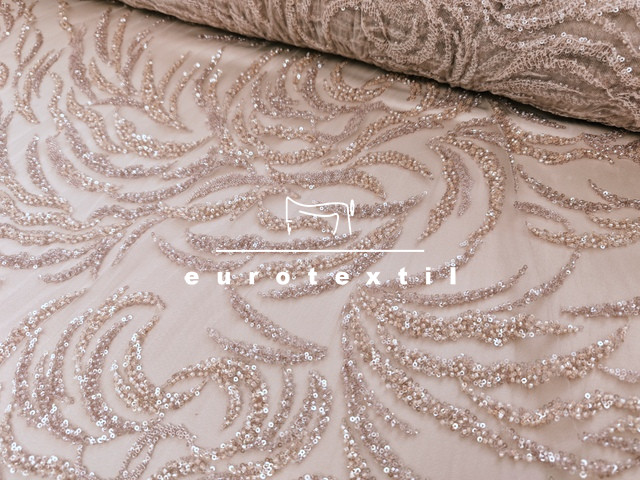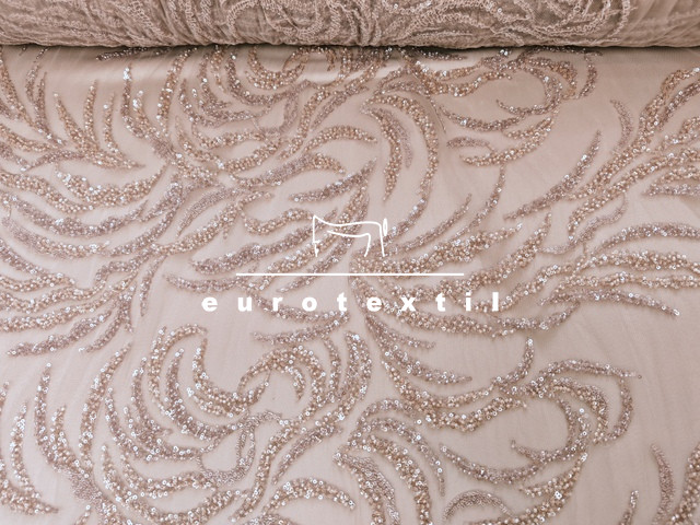 Hosszanti hullám mintás különleges alkalmi textil.Halvány rózsaszín alapon , halvány rózsaszín flitterrel és púder üveggyöngyökkel hímezve.