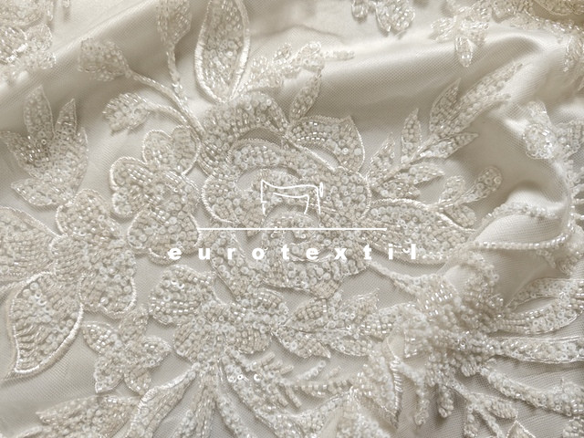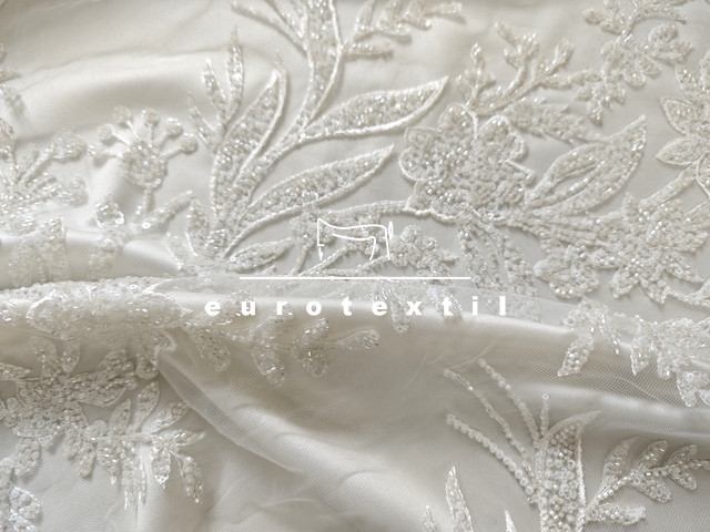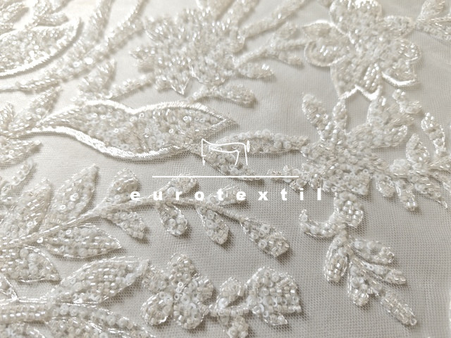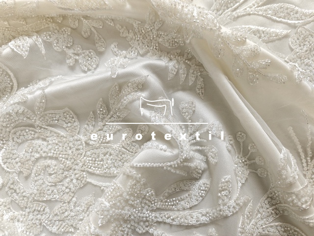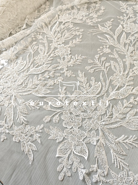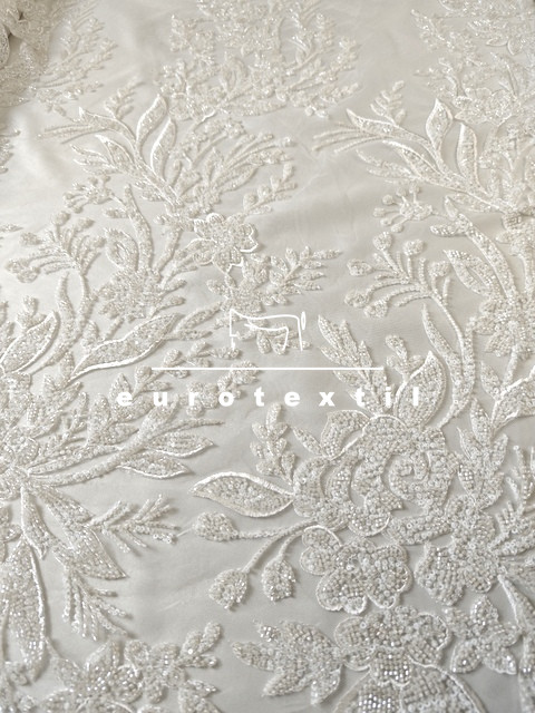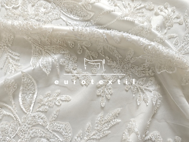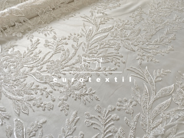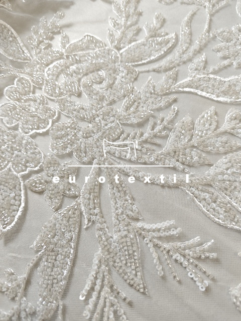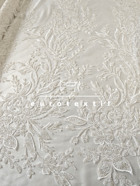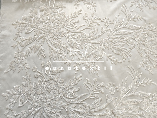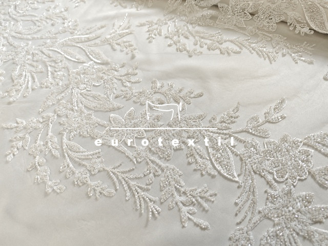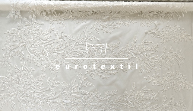 Gyöngyözött, virág hímzett, bordűrös, csipke fehér színben.Irányított mintás.