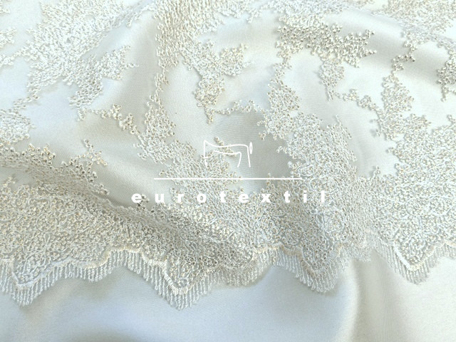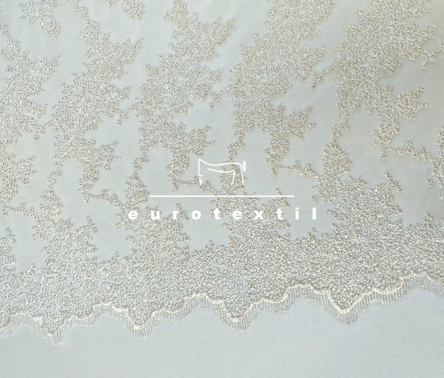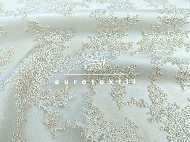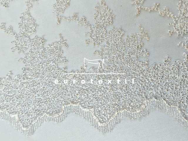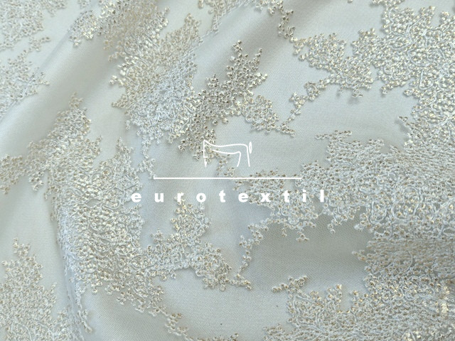 Légies, könnyű, stilizált virág mintázatú hímzett tüll csipke, fehér színben. A csipke felülete finoman arany fóliával kent , ettől fényesebb és exkluzívabb hatása van.