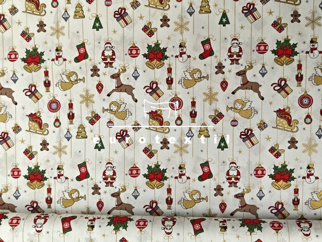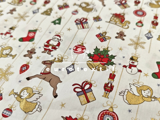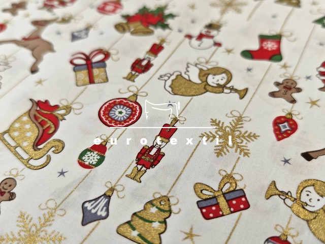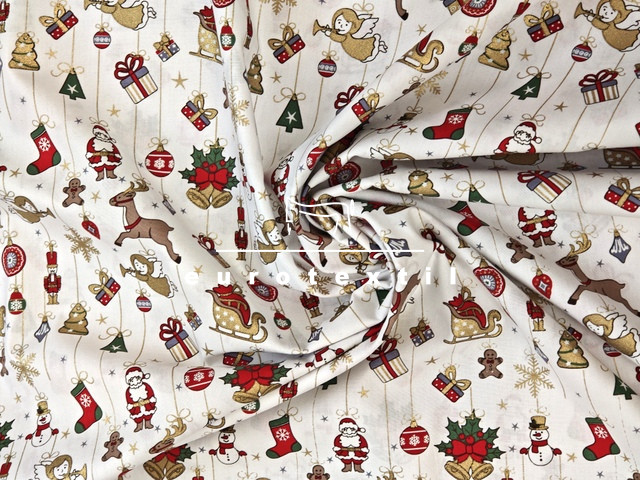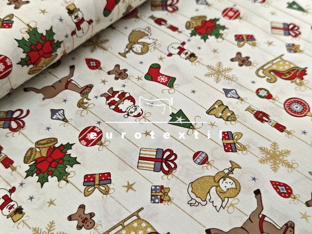 Fehér alapon színes karácsonyi motívumokkal,arany díszítéssel.