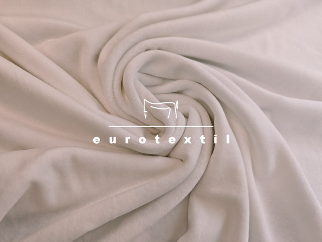Bársonyos tapintású, közepes vastagságú (240gy/m2), kevertszálas plüss anyag, fehér színben színben.Gyermek, bébi ruházatra ajánlott alapanyag.