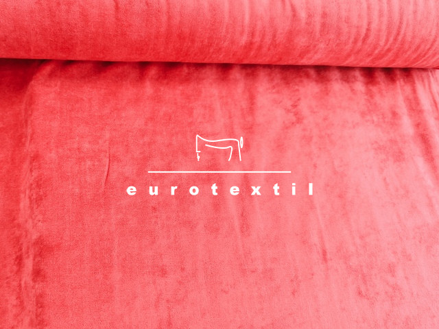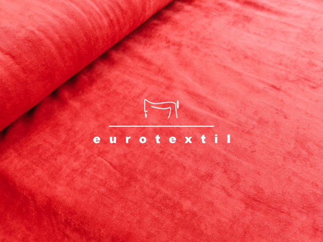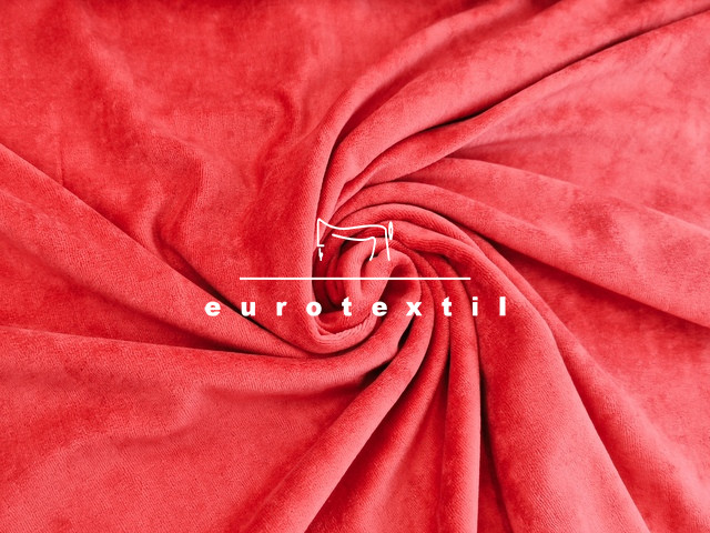 Bársonyos tapintású, közepes vastagságú (240gy/m2), kevertszálas plüss anyag, sötétpiros színben.Gyermek, bébi ruházatra ajánlott alapanyag.
