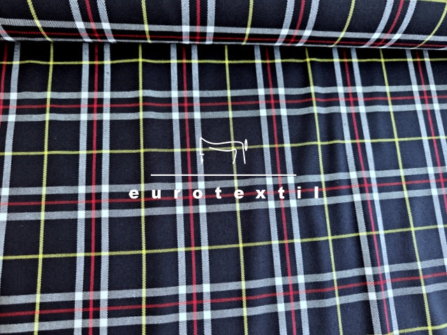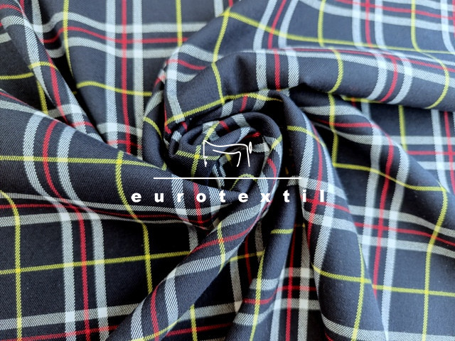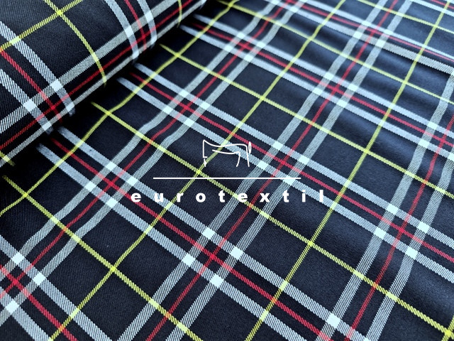 Szövött ( Tartán ) kockás, kevert szálas elasztikus szövet anyag, sötétkék alapon, fehér, piros, sárga kockás színkombinációban. Kosztümök, blézerek, mellények, nadrágok készítéséhez ajánljuk.