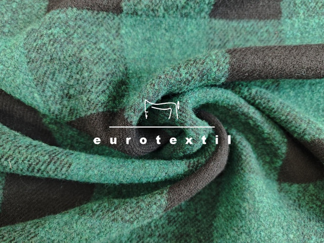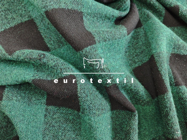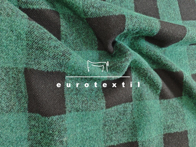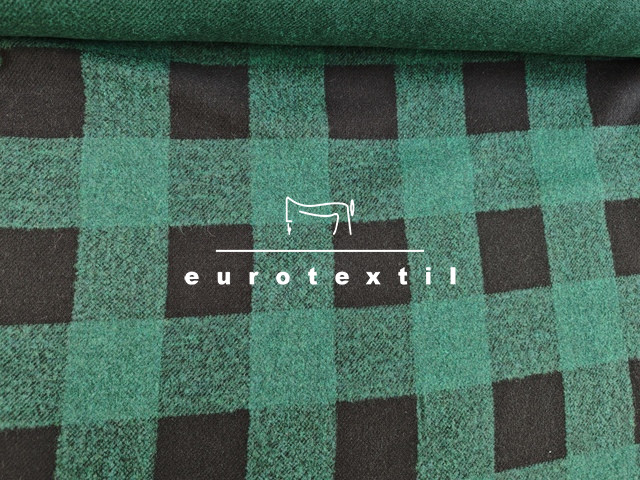 Fenyőzöld, fekete nagy kockás kevert szálas gyapjú kabátszövet. Kabátok, zakók, blézerek készítéséhez ajánlott alapanyag.