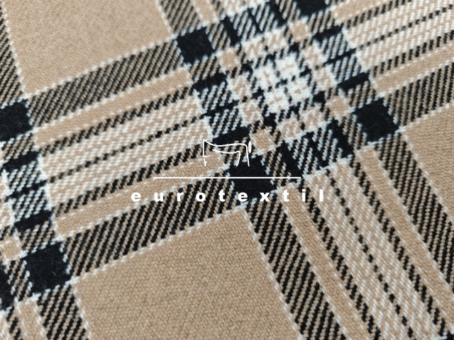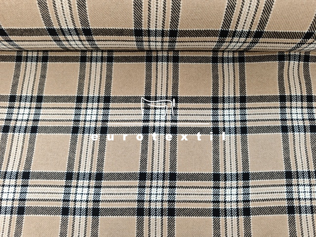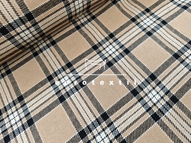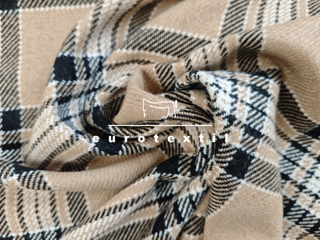 Bézs alapon, fekete, ekrű, nagy kockás kevert szálas vékony gyapjú kabátszövet. Kabátok, zakók, blézerek készítéséhez ajánlott alapanyag.