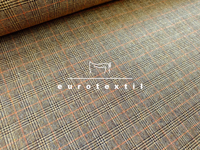 Bézs, barna, narancs kockás kevert szálas vékony gyapjú kabátszövet. Kabátok, zakók, blézerek készítéséhez ajánlott alapanyag.