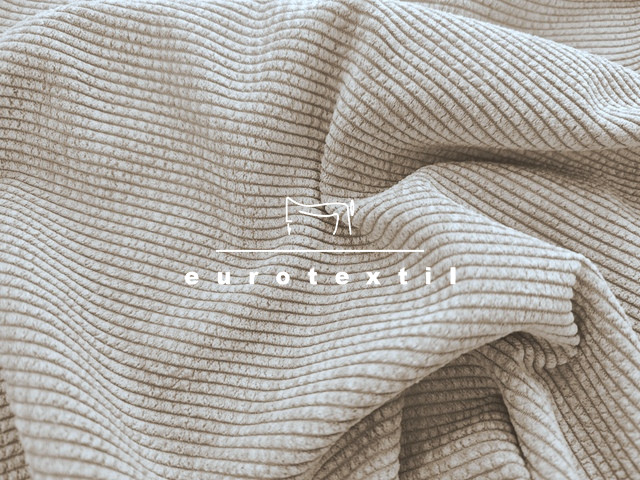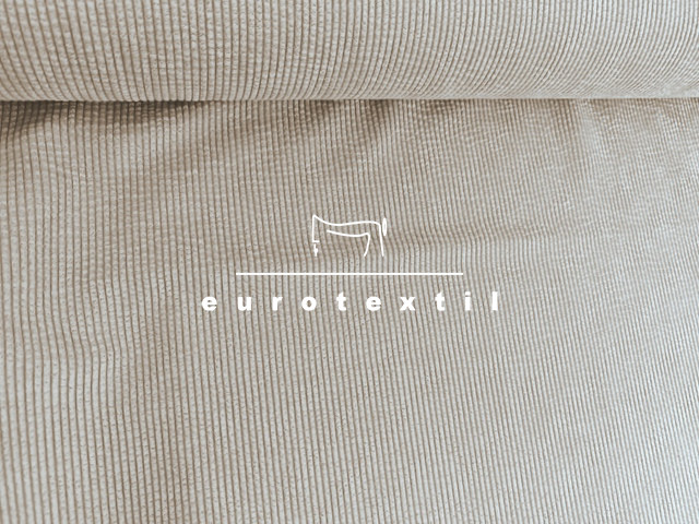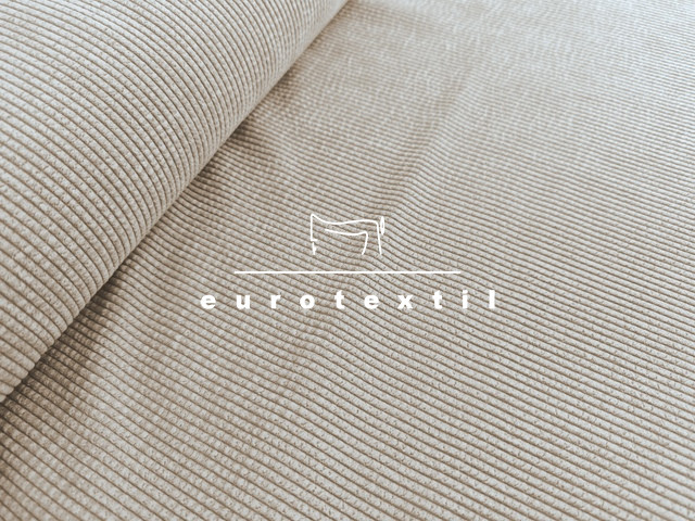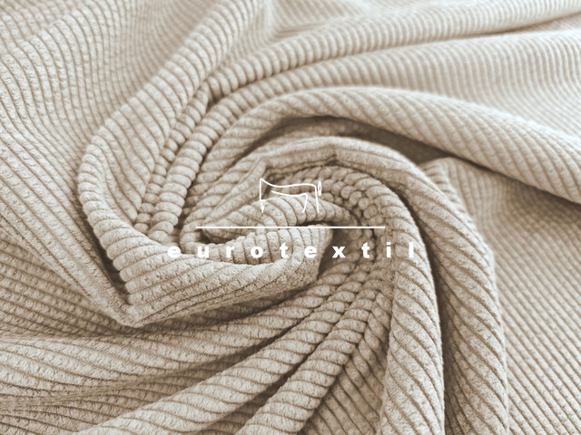 Bézs színű, jó esésű elasztikus kevert szálas kordbársony, enyhén koptatott felülettel.