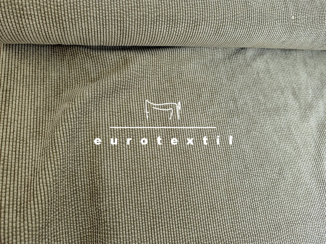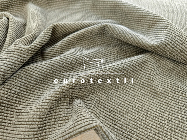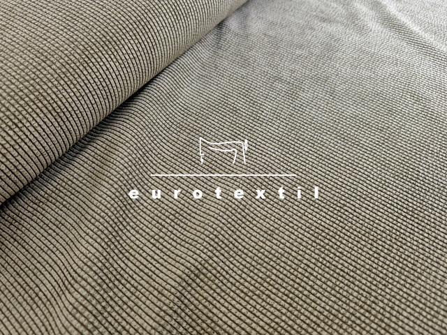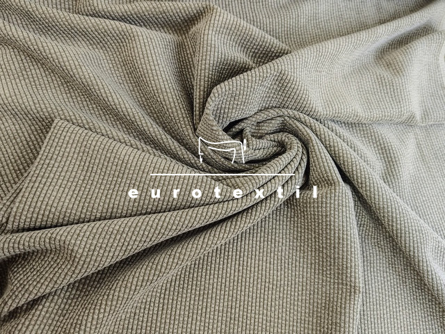 Keki színű, jó esésű elasztikus kevert szálas kordbársony, enyhén koptatott felülettel.