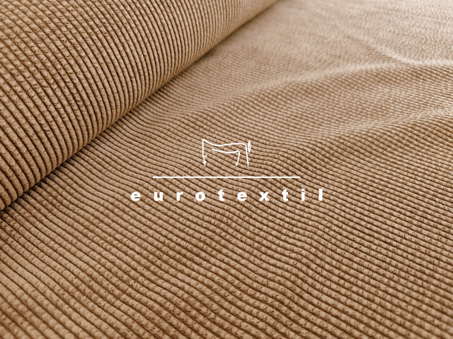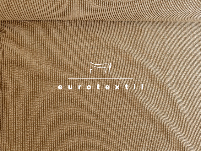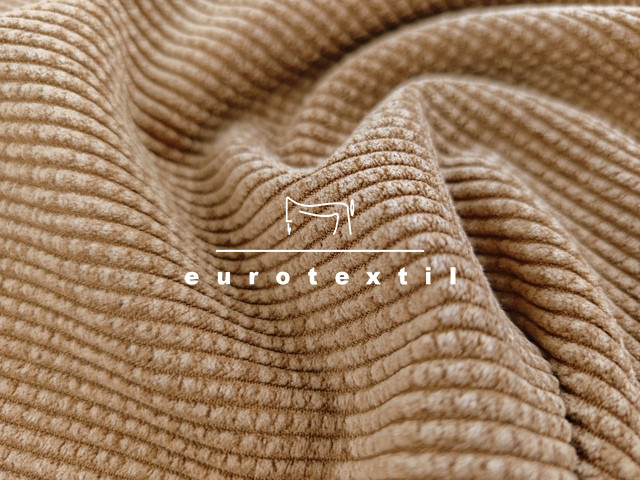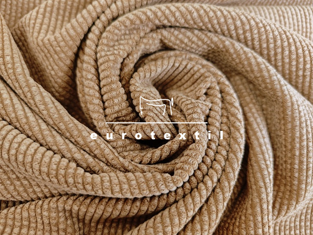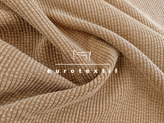 Camel színű, jó esésű elasztikus kevert szálas kordbársony, enyhén koptatott felülettel.