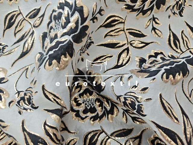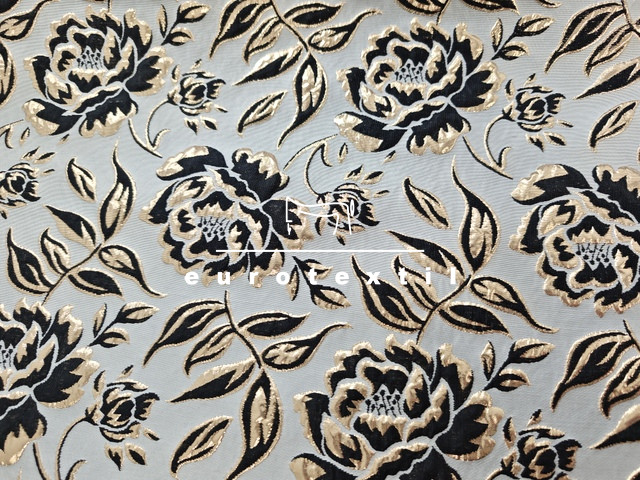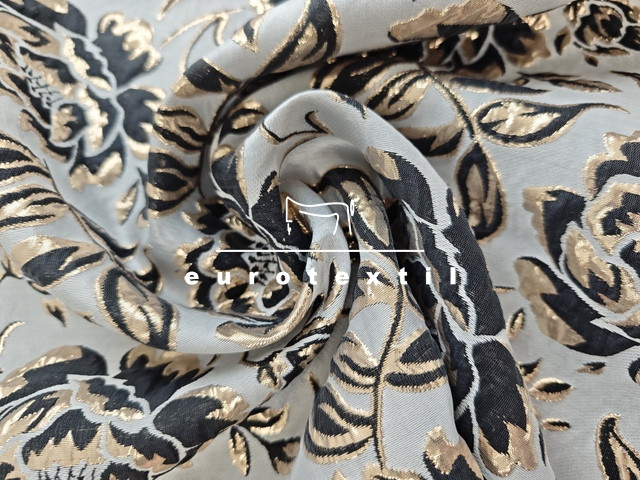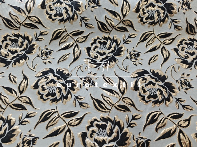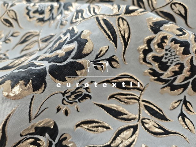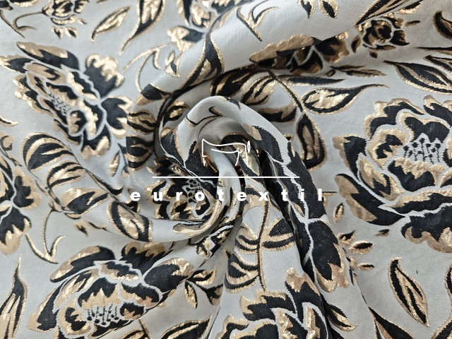 Közepes vastagságú, jacquard mintázatú metál szálas brokát anyag, világos szürke alapon fekete, arany virág mintázatú szín kombinációban. Alkalmi ruhák, kabátkák, jelmezek, mellények függönyök, dekorációk készítésére ajánlott alapanyag.