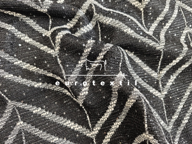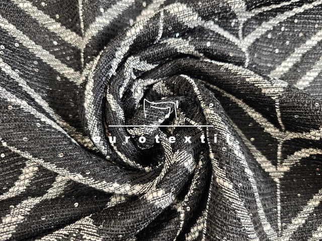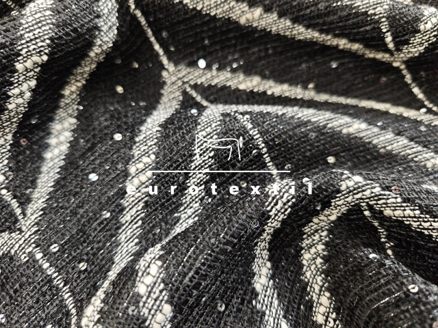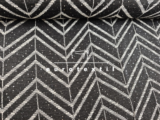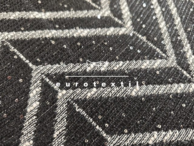 Középvastag buklé anyag, elegáns fekete, fehér színkombinációban, ezüst lurex szállal, Jól formázható anyag és kiváló tartású. Kosztümök, Chanel blézerek,ruhák, szoknyák készítéséhez ajánljuk.