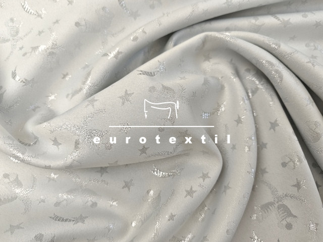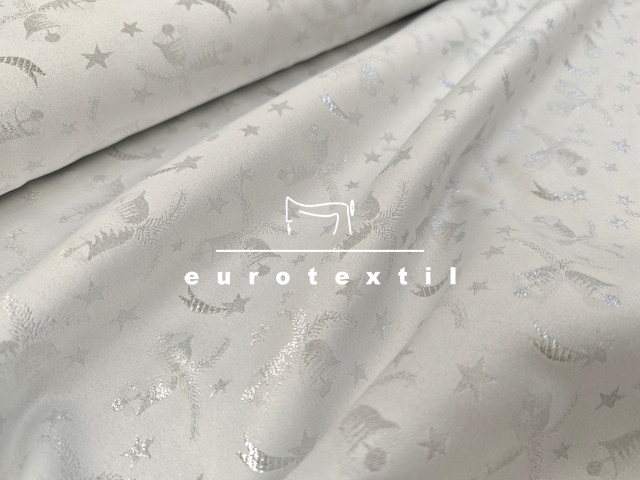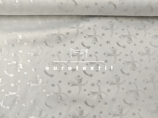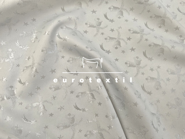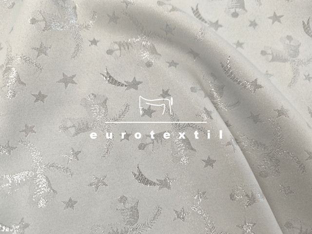 Vékony ezüst lurex szállal átszőtt dekor selyem, karácsonyi motívumokkal.