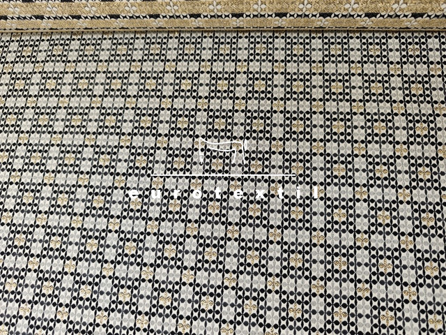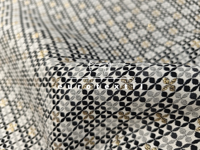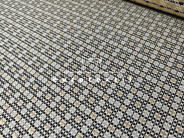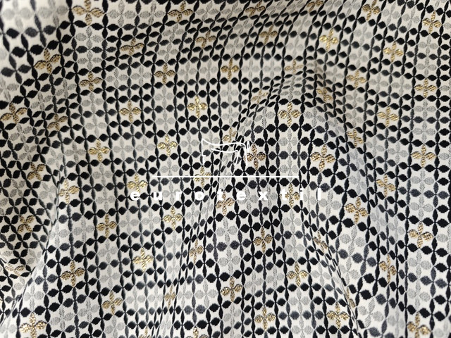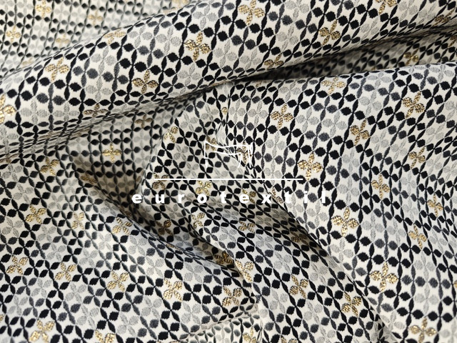 Lurex szálas középvastag jacquard anyag. Szürke-fekete-arany színekkel, geometriai mintával.