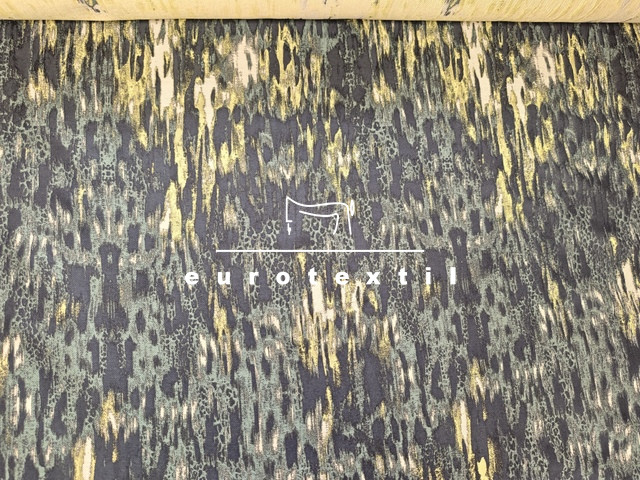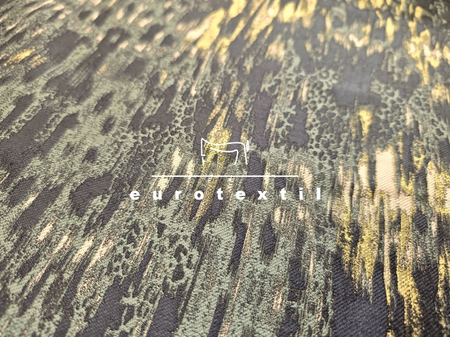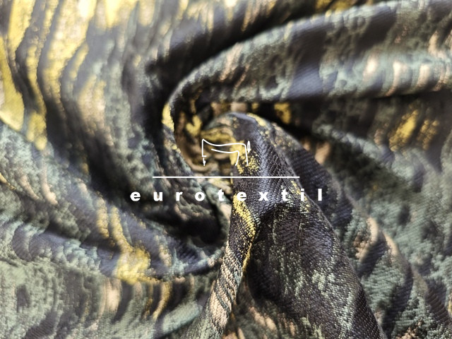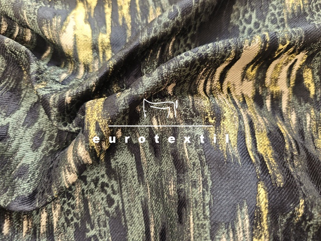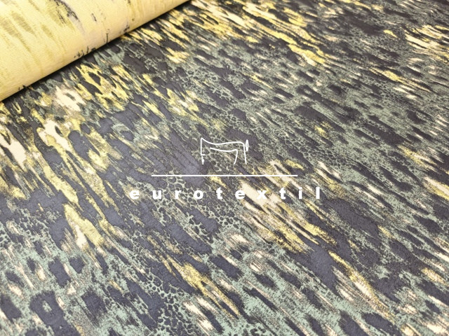 Elegáns, középvastag jacquard anyag. Fekete, zöld, citromsárga elmosódott színekkel, absztrakt mintával.