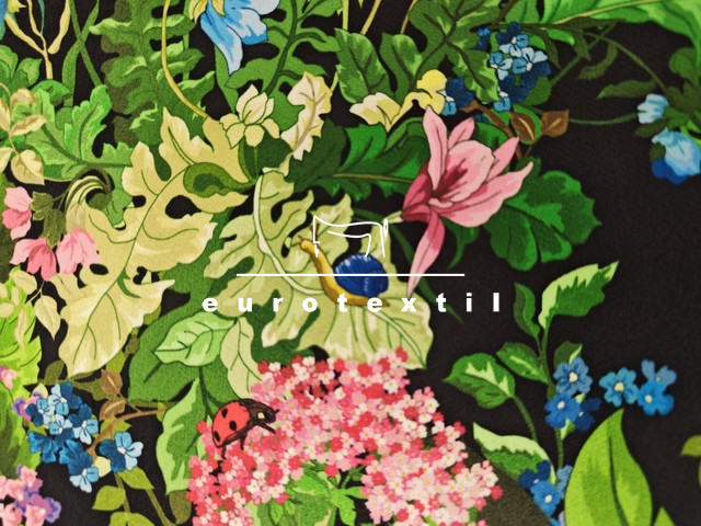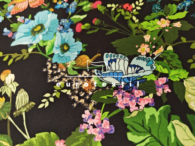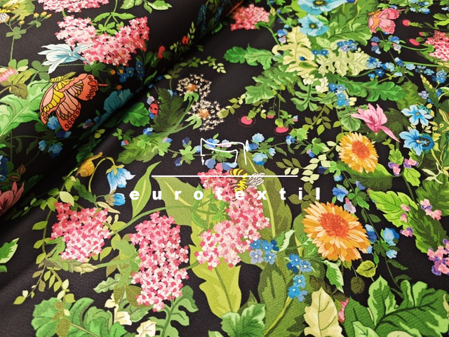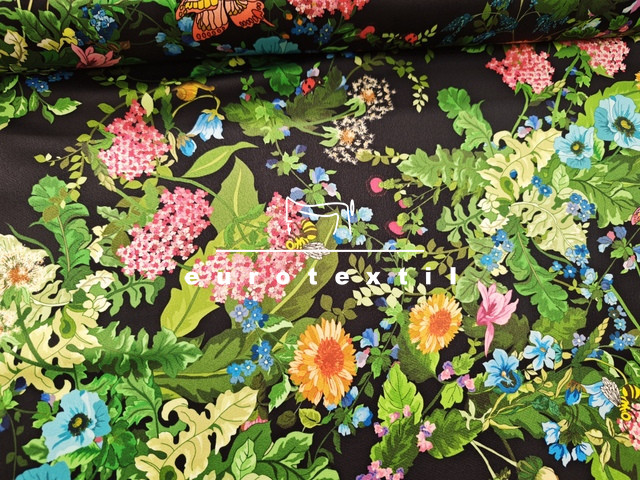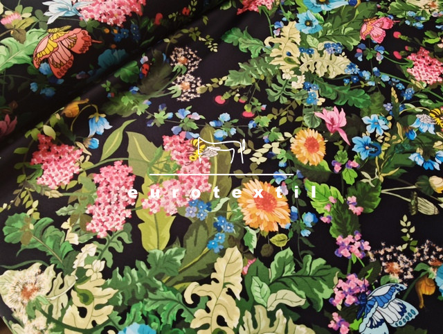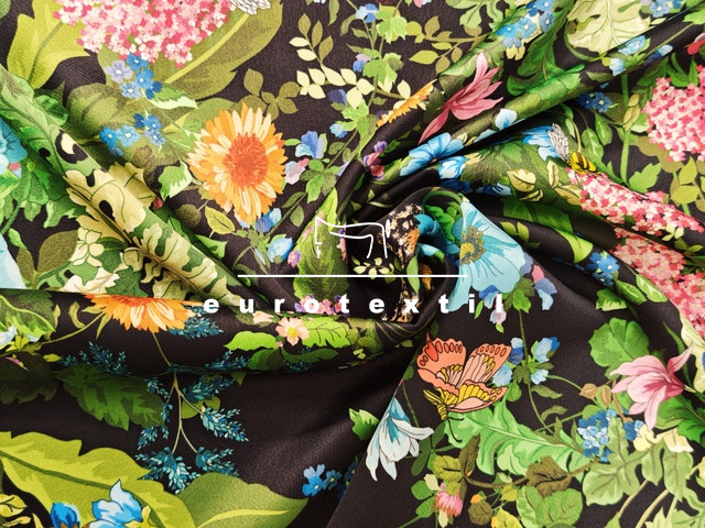 Vastag fényes, zsorzsett szövésű nehézselyem, fekete alapon színes virágos mintával. Fénye selymesen elegáns, nem tolakodó,alkalmi öltözetekre kifejezetten ajánljuk.