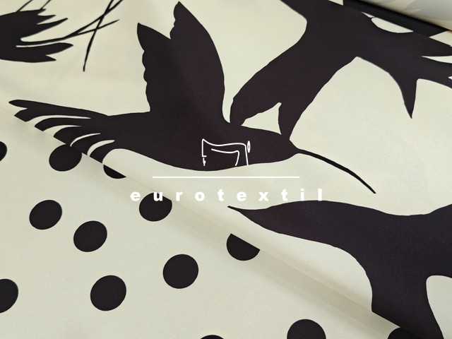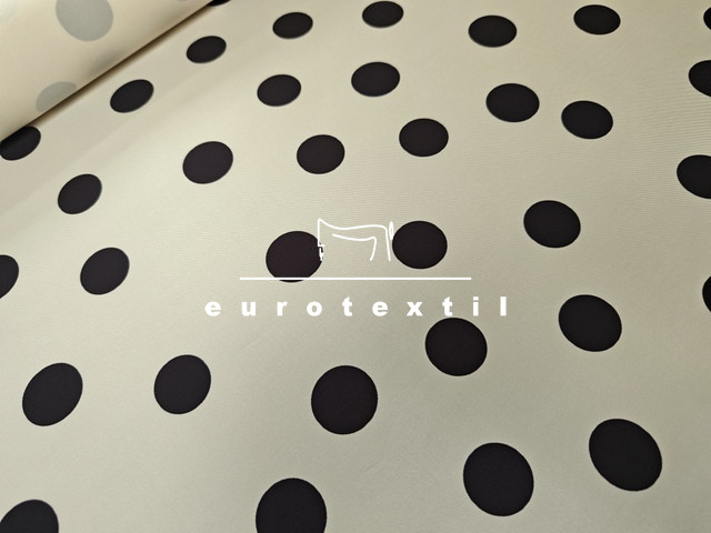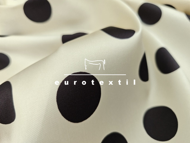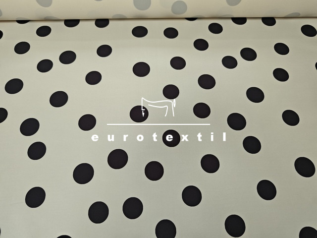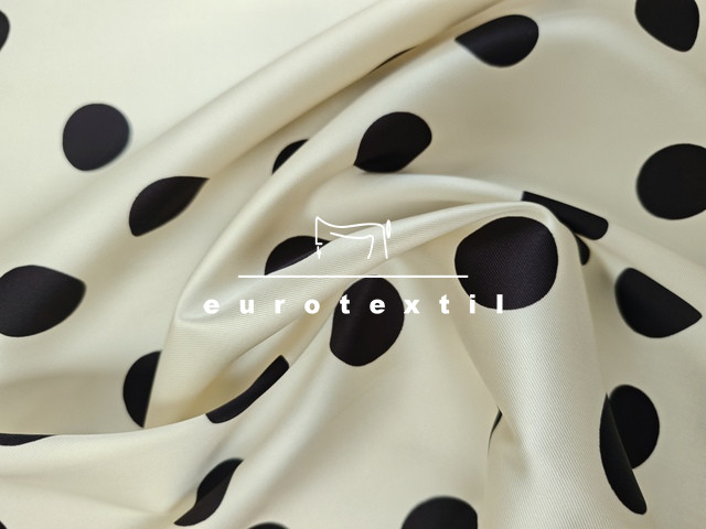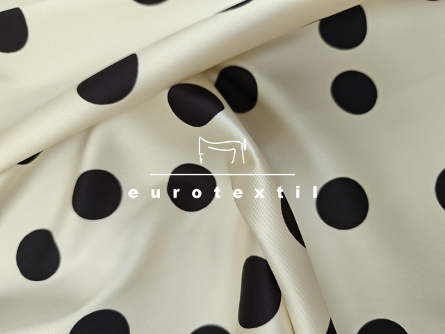 Jó tartású, twill felületű düsessz , ekrű alapon nagy pettyes mintával.