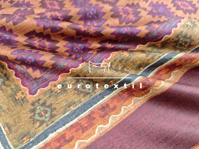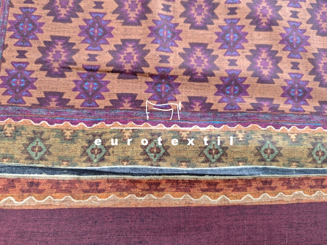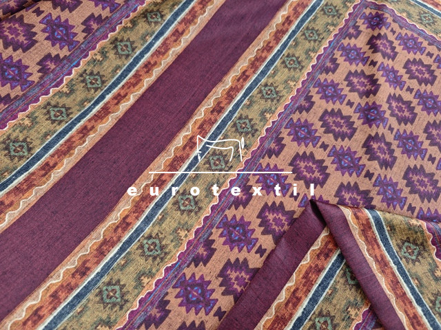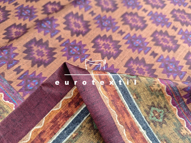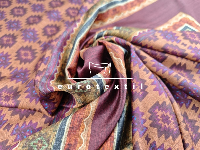 Mintaelemes fényes felületű, lágy viszkóz selyem anyag. Bordó alapon kendő mintával. Finom fénye, jó esése elegánssá teszi, alkalmas ruhák, tunikák, blúzok, sálak készítésére.