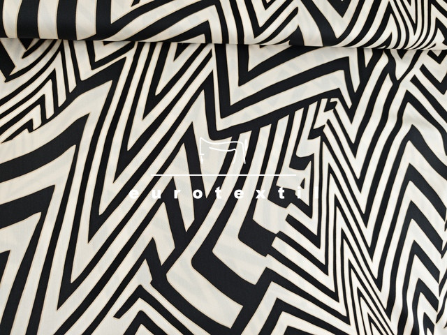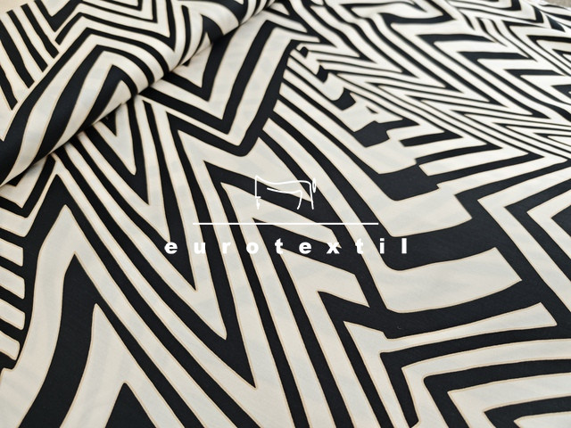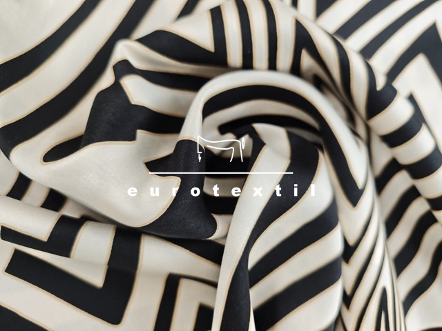 Finoman fényes felületű, lágy viszkóz selyem,egybefüggő geometriai mintával.Alapszínei bézs, fekete.