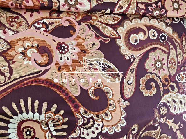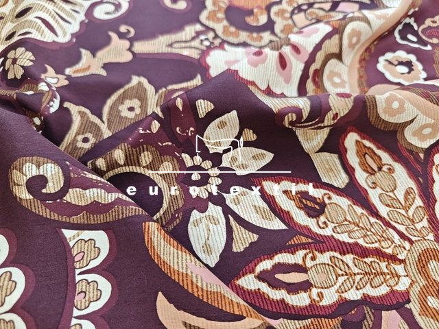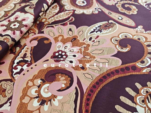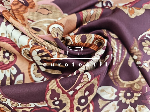 Finoman fényes felületű, lágy viszkóz selyem,egybefüggő geometriai mintával.Bordó alapon puder-rozsda-drapp nagy léptékű paisley (kasmír) mintával.