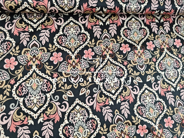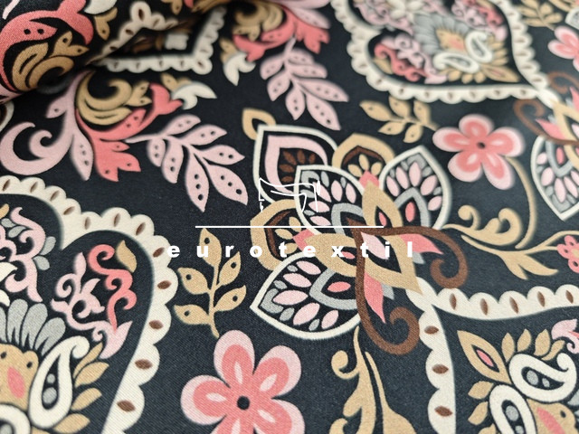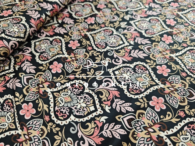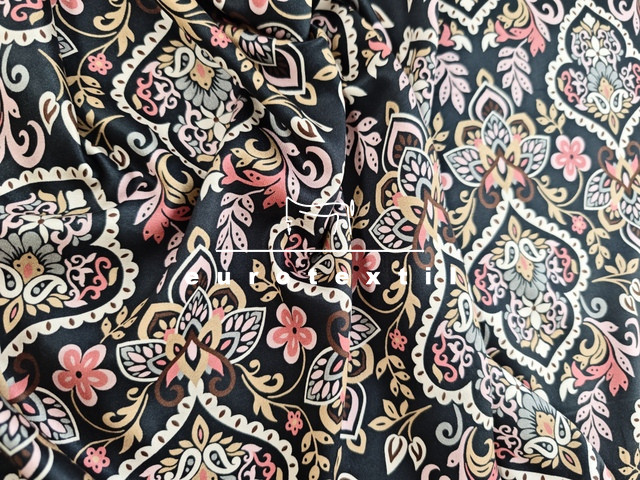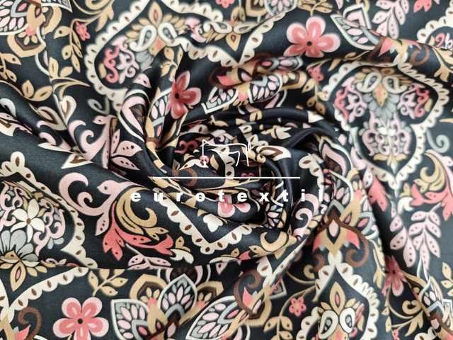 Finoman fényes felületű, lágy viszkóz selyem, keleti hatású mintával.Fekete alapon puder-drapp színekkel.