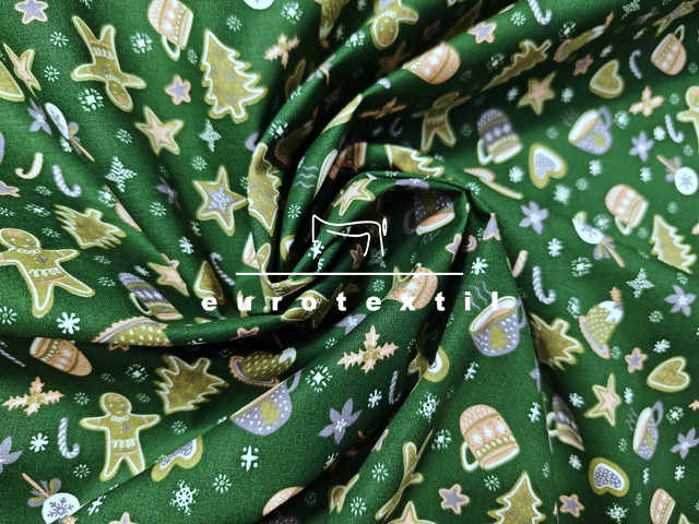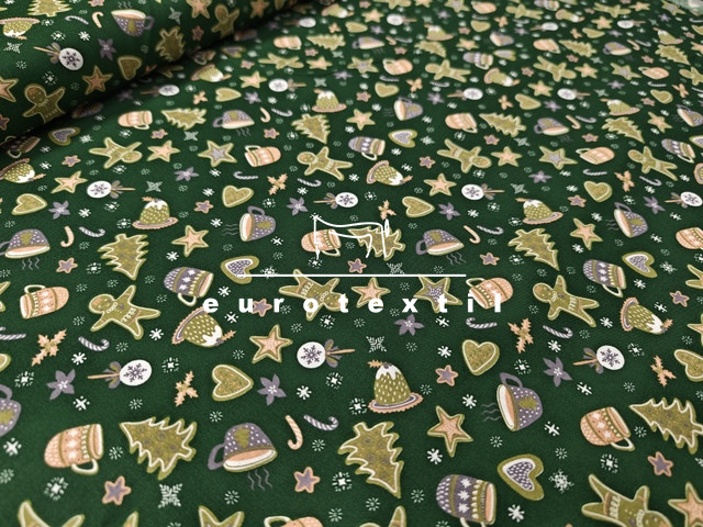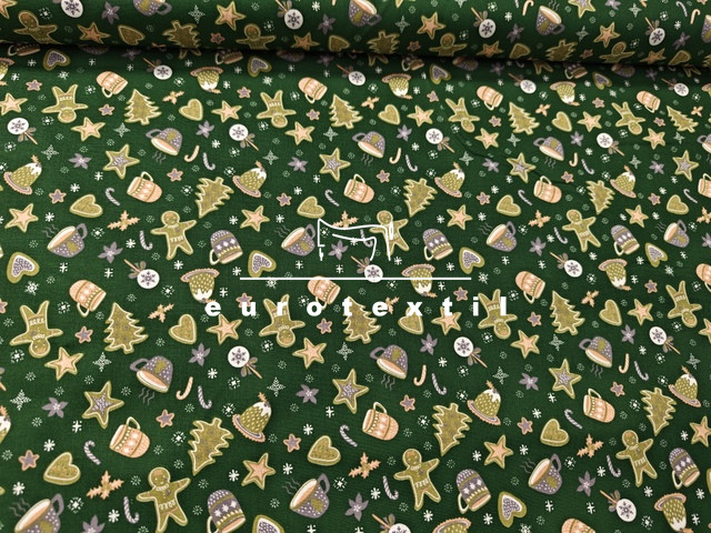 Sötét zöld alapon mézeskalács és csésze figurás mintával.