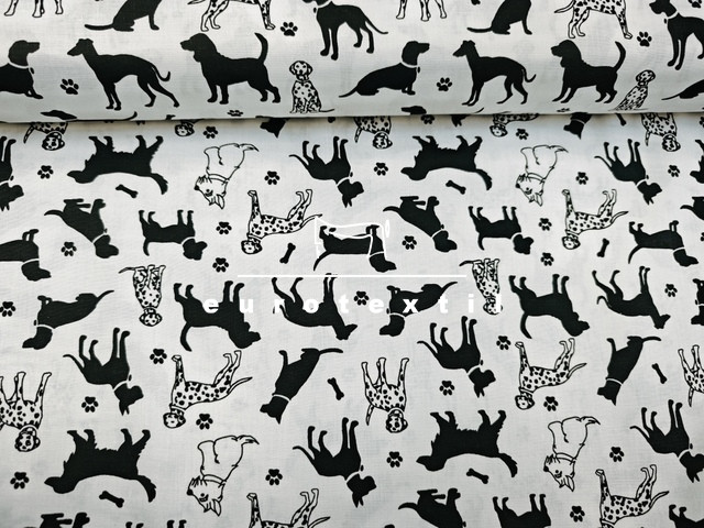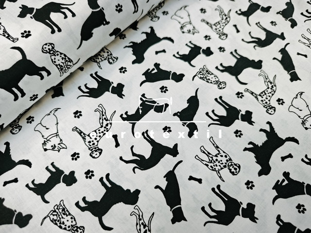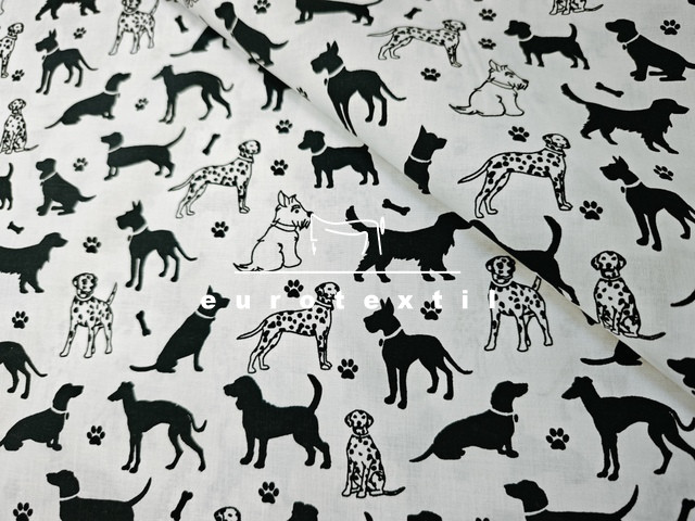 fehér alapon fekete kutya mintával.Légáteresztő, jó nedvszívó képességű pamut anyag, alkalmas ágyneműk, párnahuzatok, lakástextilek készítéséhez.