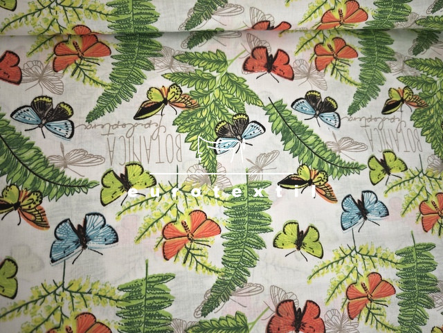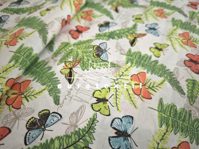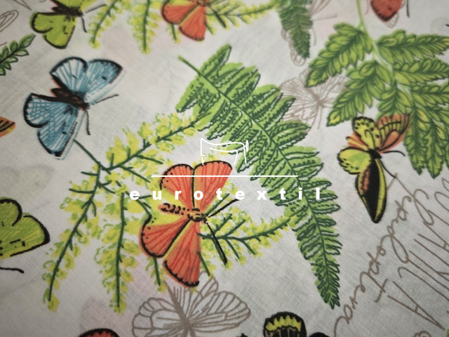 Nyomott mintás pamut karton, fehér alaponleveles-pillangós mintával. Asztalterítők, lakástextilek, gyermek ágyneműk és ruhák készítéséhez ajánljuk.