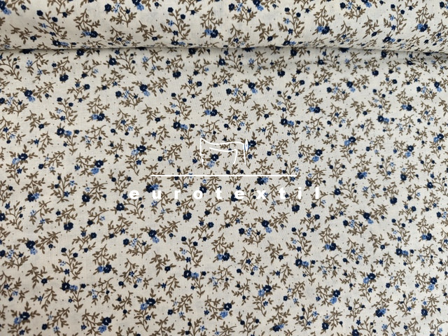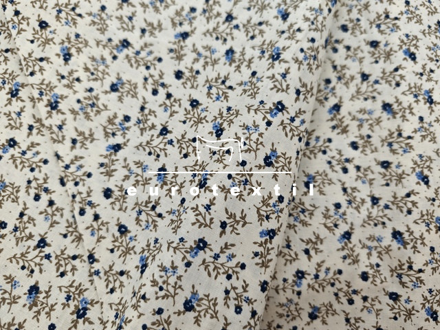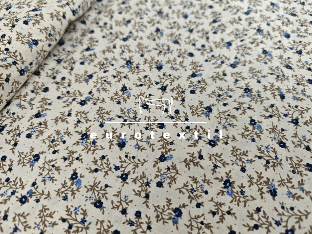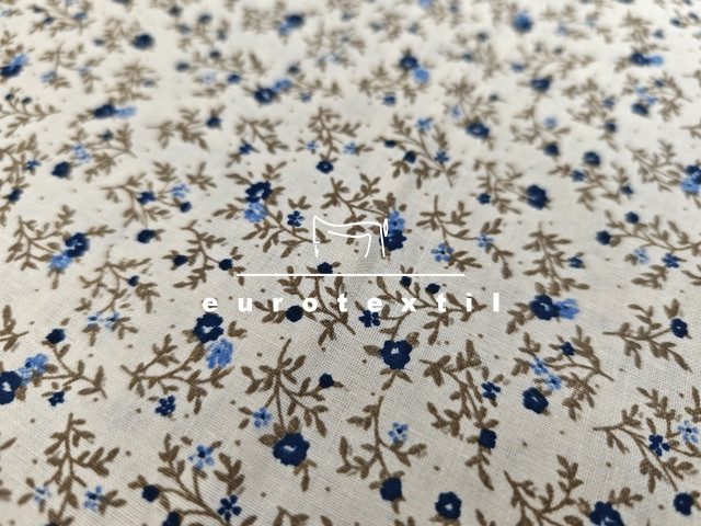 Nyomott mintás pamut karton,törtfehér alapon apró kék virág mintával. Lakástextilek, ágyneműk készítéséhez ajánljuk.