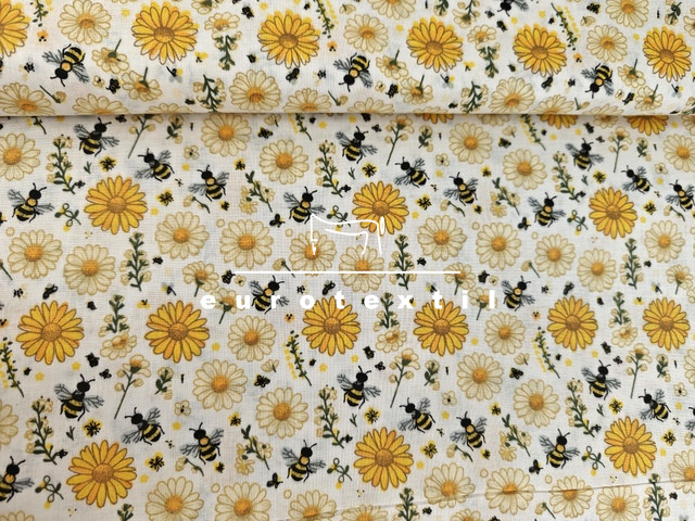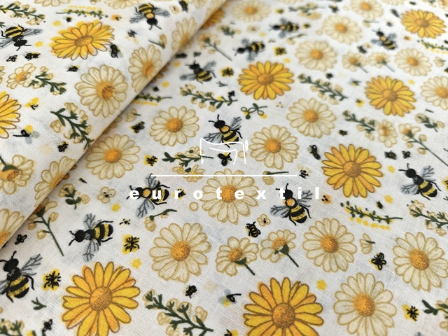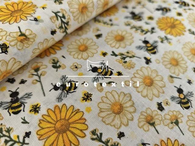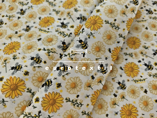 Nyomott mintás pamut karton,törtfehér alapon sárga virág mintával. Lakástextilek, ágyneműk készítéséhez ajánljuk.