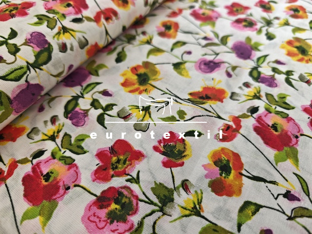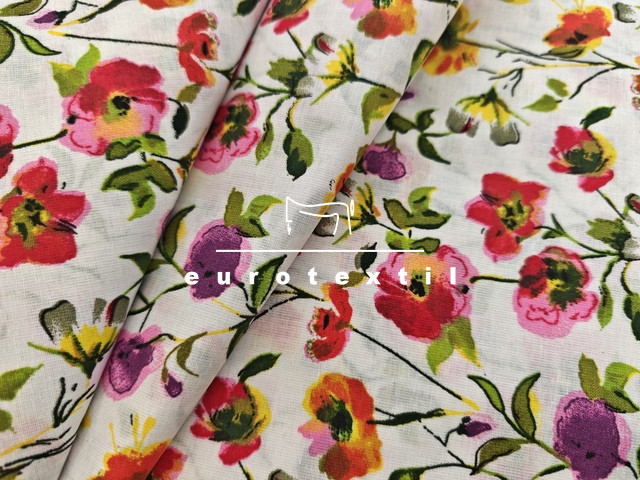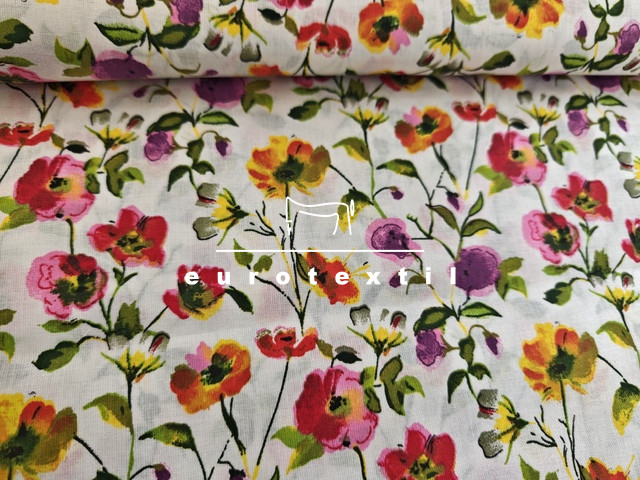 Nyomott mintás pamut karton, fehér alapon színes virág mintával. Lakástextilek, ágyneműk, Nyári ruhák, gyermek ruhák készítéséhez ajánljuk. 130 g/m2