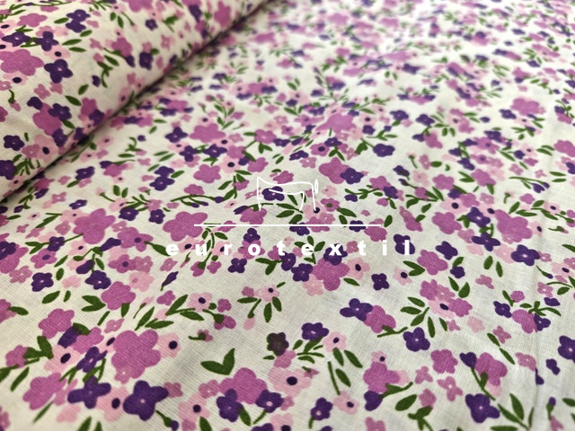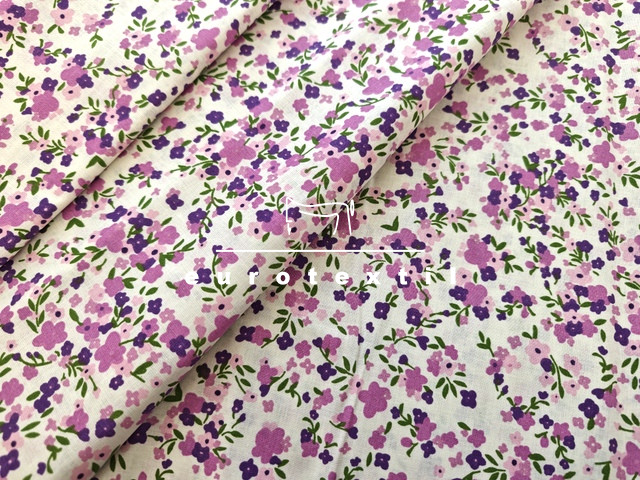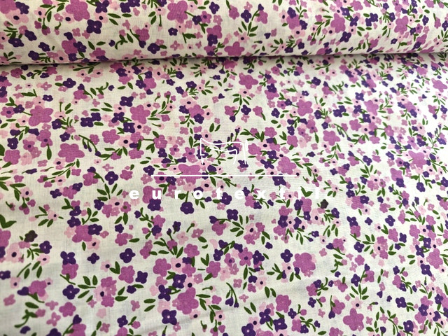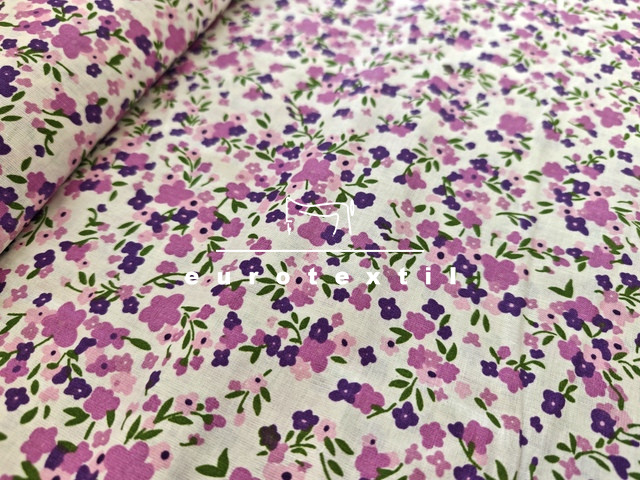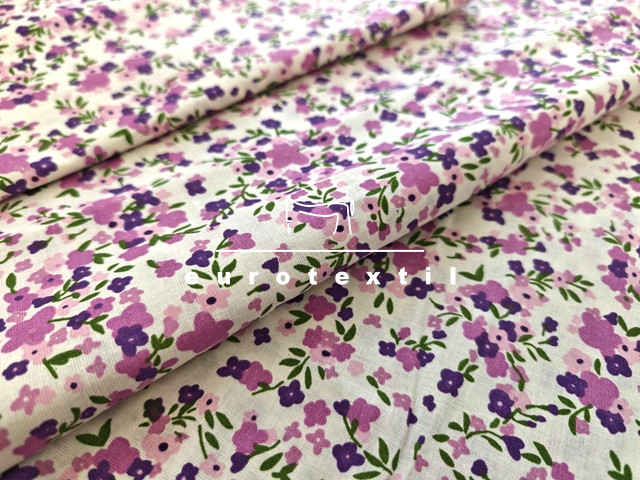 Nyomott mintás pamut karton, törtfehér alapon kétféle lila apró virág mintával. Lakástextilek, ágyneműk, Nyári ruhák, gyermek ruhák készítéséhez ajánljuk.