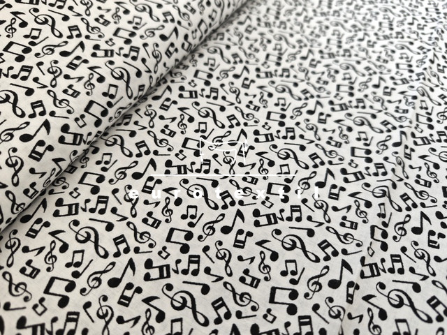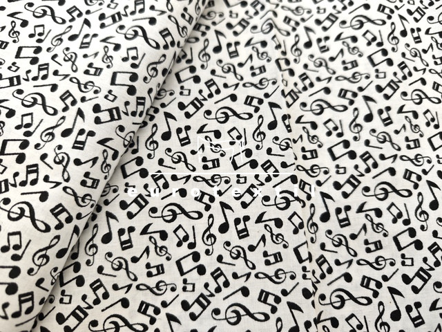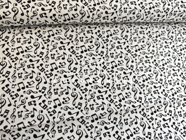 Nyomott mintás pamut karton, fehér alapon fekete hangjegyes mintával. Lakástextilek, ágyneműk, Nyári ruhák, gyermek ruhák készítéséhez ajánljuk.