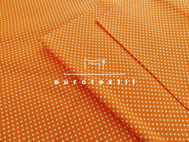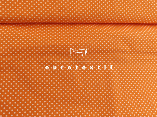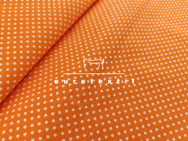 Nyomott mintás pamut karton,narancs alapon fehér tűpöttyös mintával. Lakástextilek, ágyneműk, Nyári ruhák, gyermek ruhák készítéséhez ajánljuk.