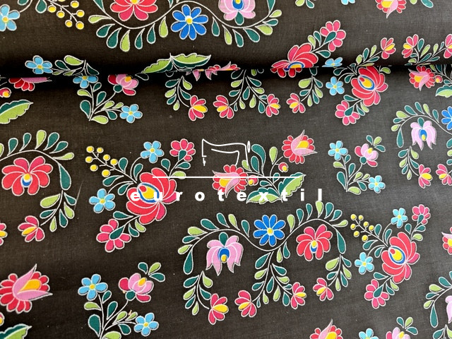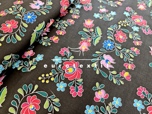 Nyomott mintás pamut karton, fekete alapon matyó mintával. Asztalterítők, lakástextilek, ágyneműk és nyári öltözetek készítéséhez ajánljuk.