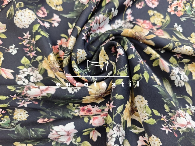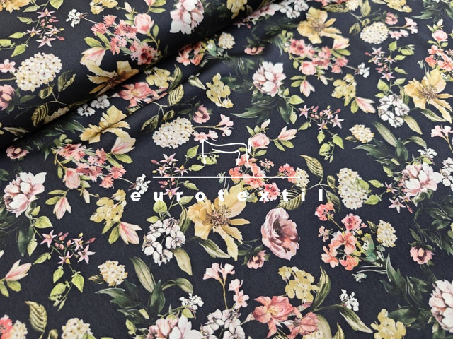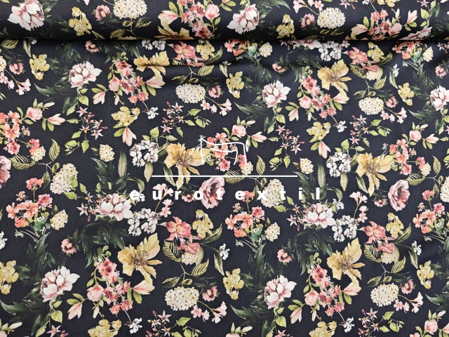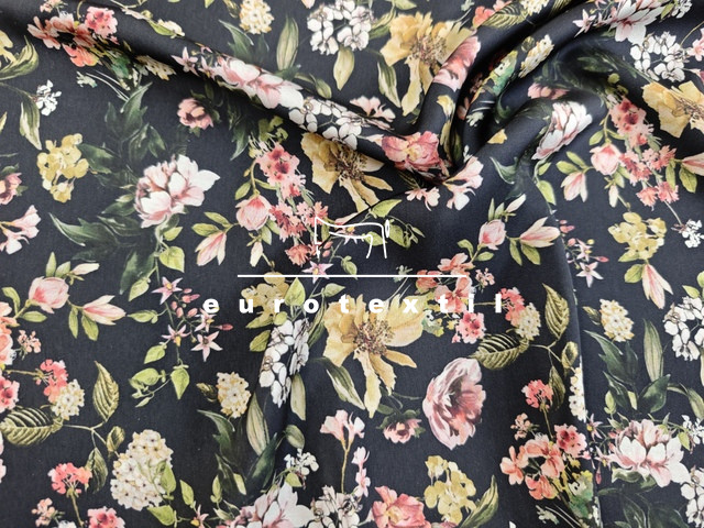 Fekete alapon sűrű színes virág mintákkal.