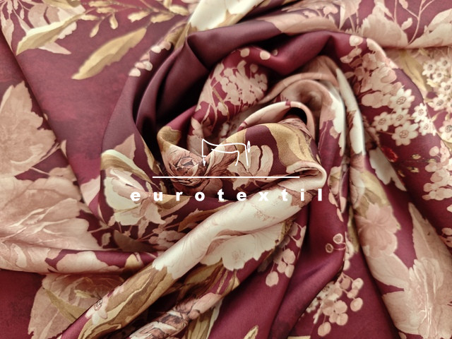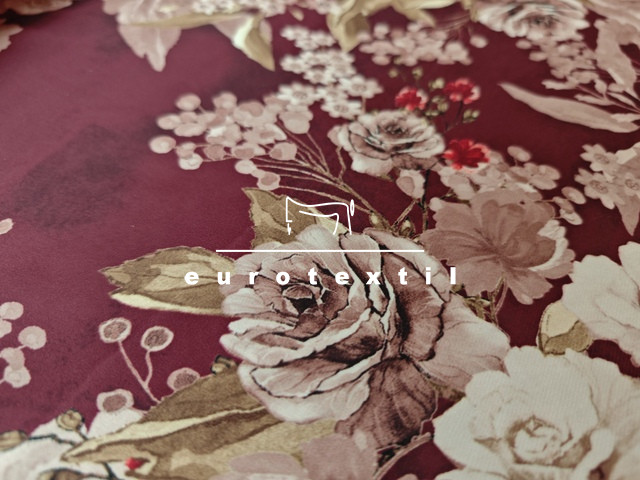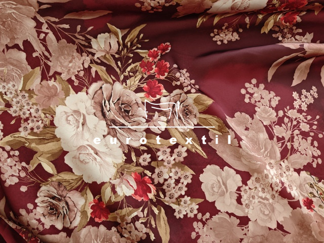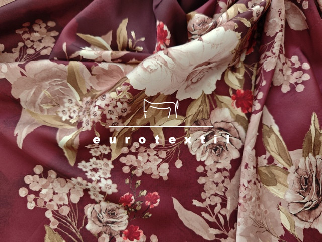 Selyemfényű lágy, könnyű mintás szaténselyem. Elegáns nagyon jó esésű és hűvös tapintású. Bordó alapon virágokkal.