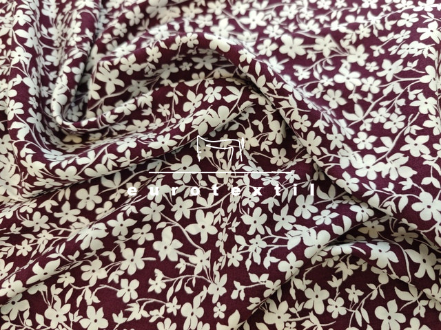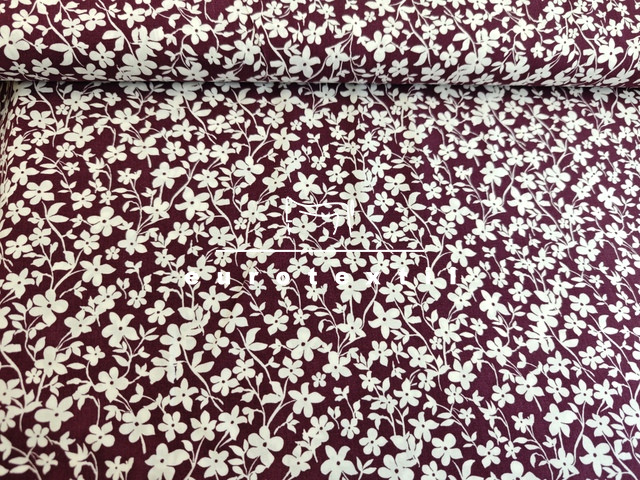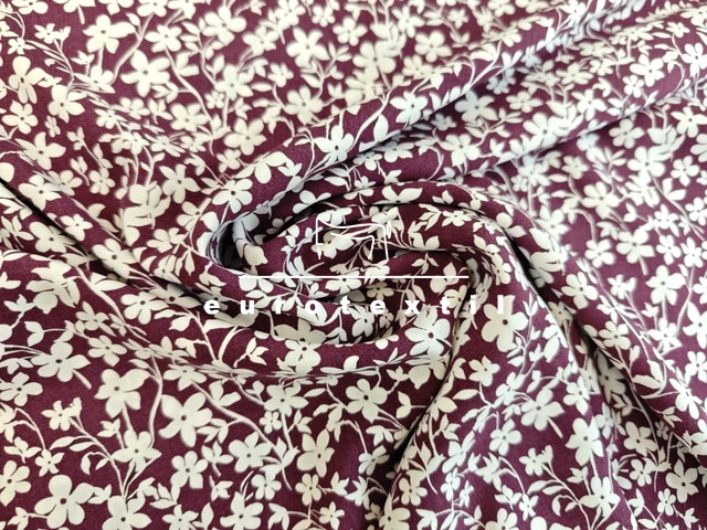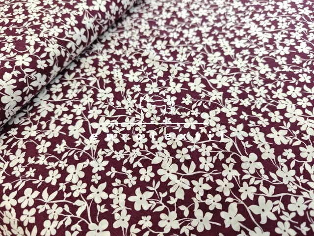 Padlizsán alapon fehér kis virágmintás viszkóz selyem.