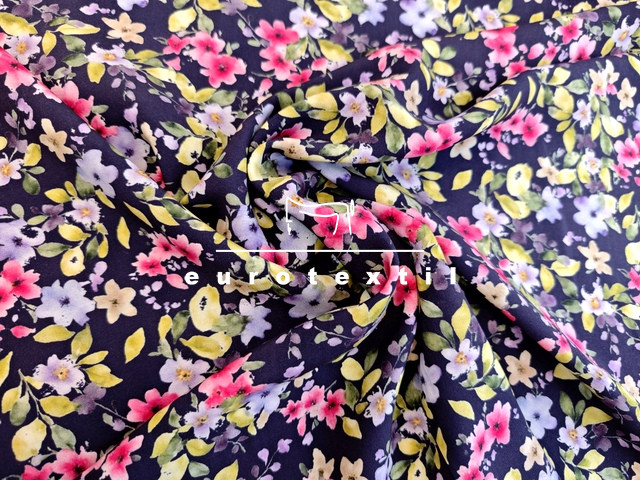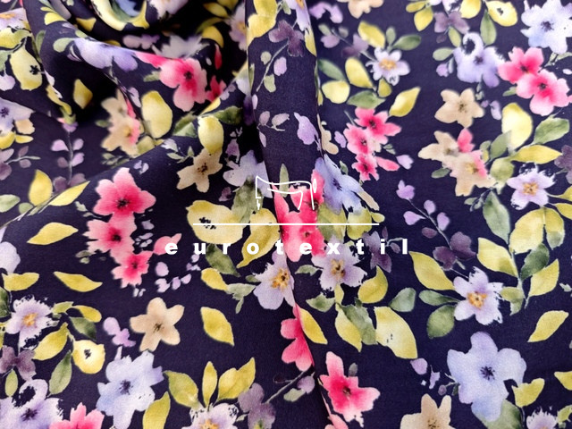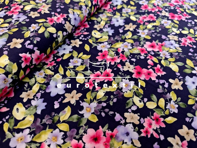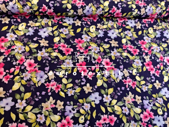 Sötétkék alapon lila-pink kis virágmintás viszkóz selyem.