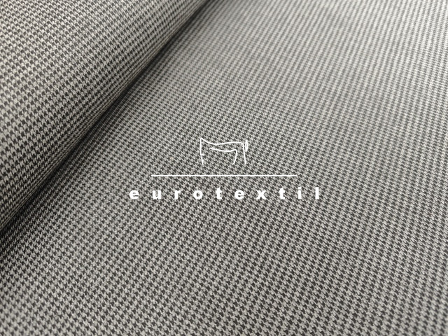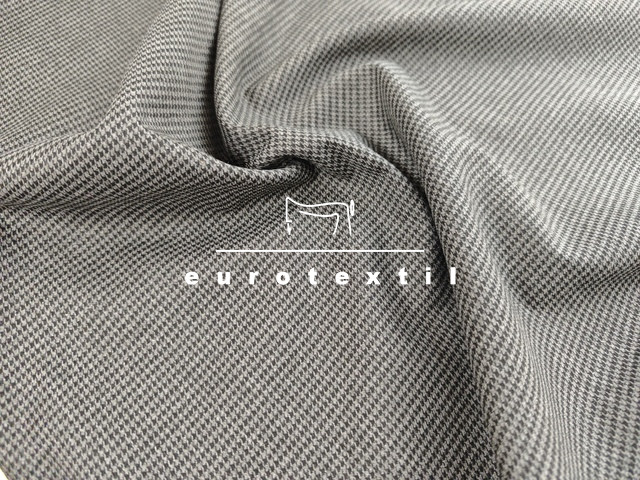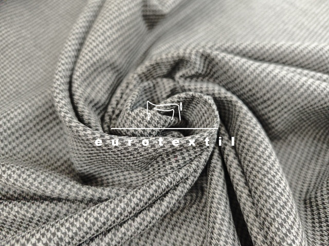 Kevert szálas, apró tyúkláb mintázatú közép vastag szövet. Jó esésű, szürke , fekete színben. Hétköznapi és elegáns kosztümök, ruhák, öltönyök, nadrágok készítéséhez kiváló alapanyag.