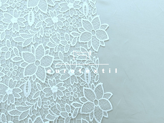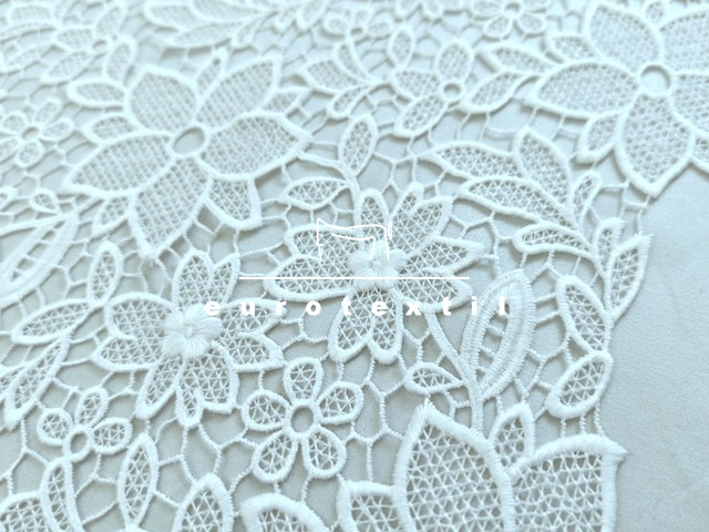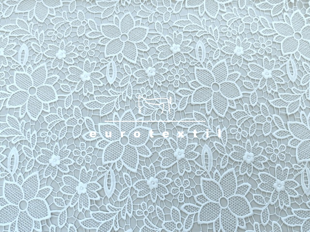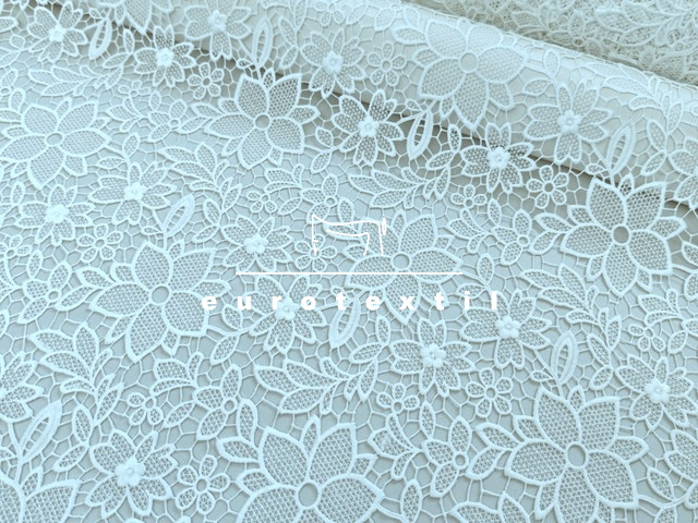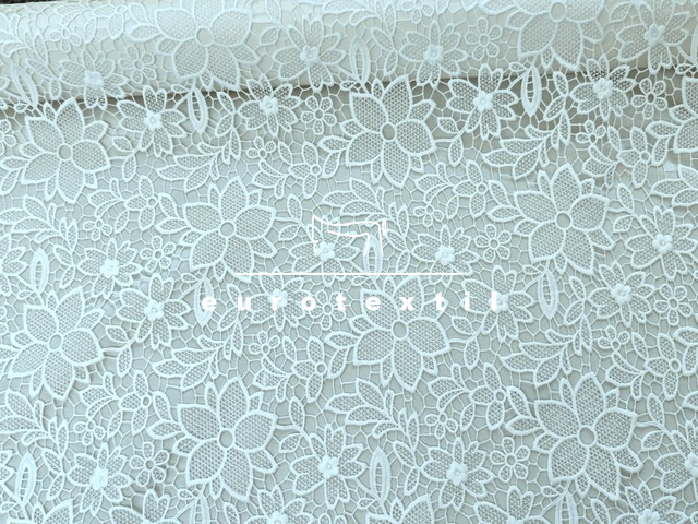 Légies hatású, virág mintázatú vágható nehéz csipke, fehér színben. Mivel vágható könnyen alakítható a különböző formákra, gyönggyel és kövekkel díszíthető.